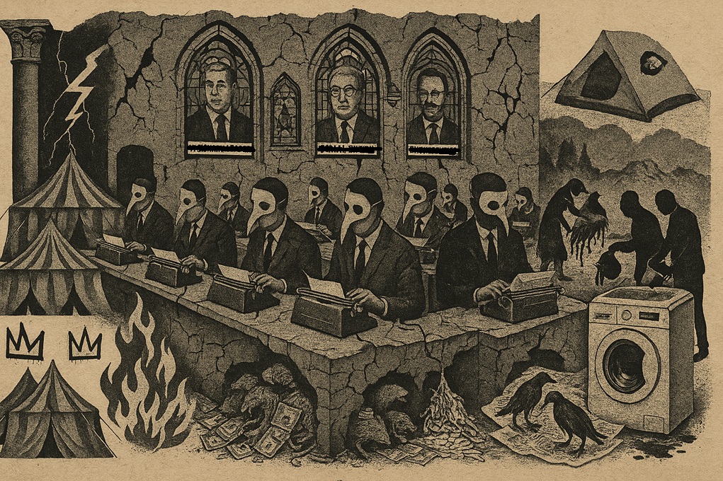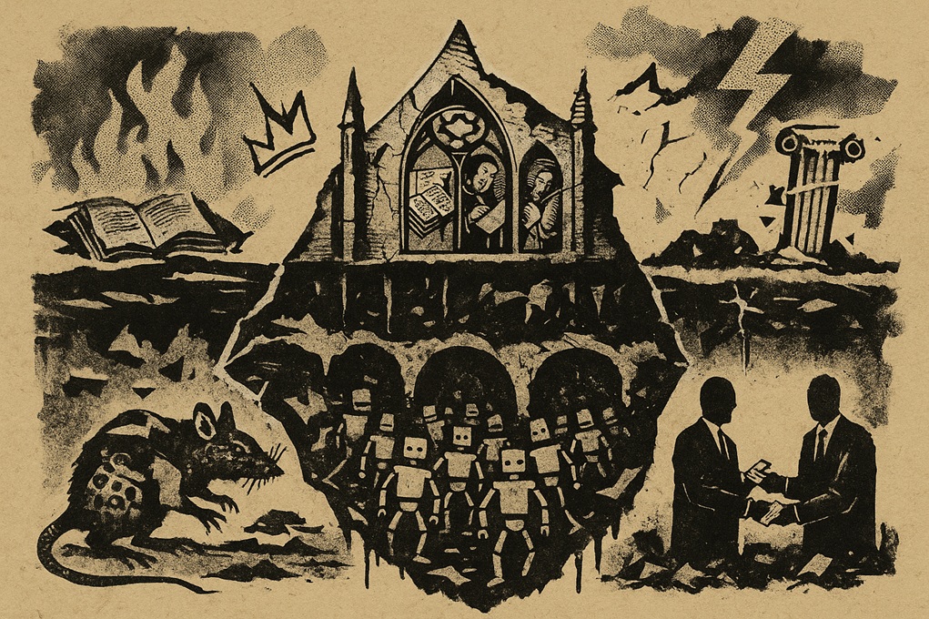 Una catedral del conocimiento, pero con un sótano que huele a cloaca. Sus pasillos no son de mármol: son más bien túneles húmedos donde se pelean gobiernos, editores solitarios y mafias vendiendo relevancia. Hay trincheras de barro, peleas intestinas, ejércitos de bots y corporaciones sobornando editores como si fueran sicarios del relato.